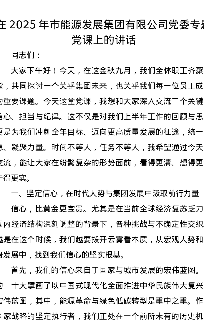 在2025年市能源发展集团有限公司党委专题党课上的讲话