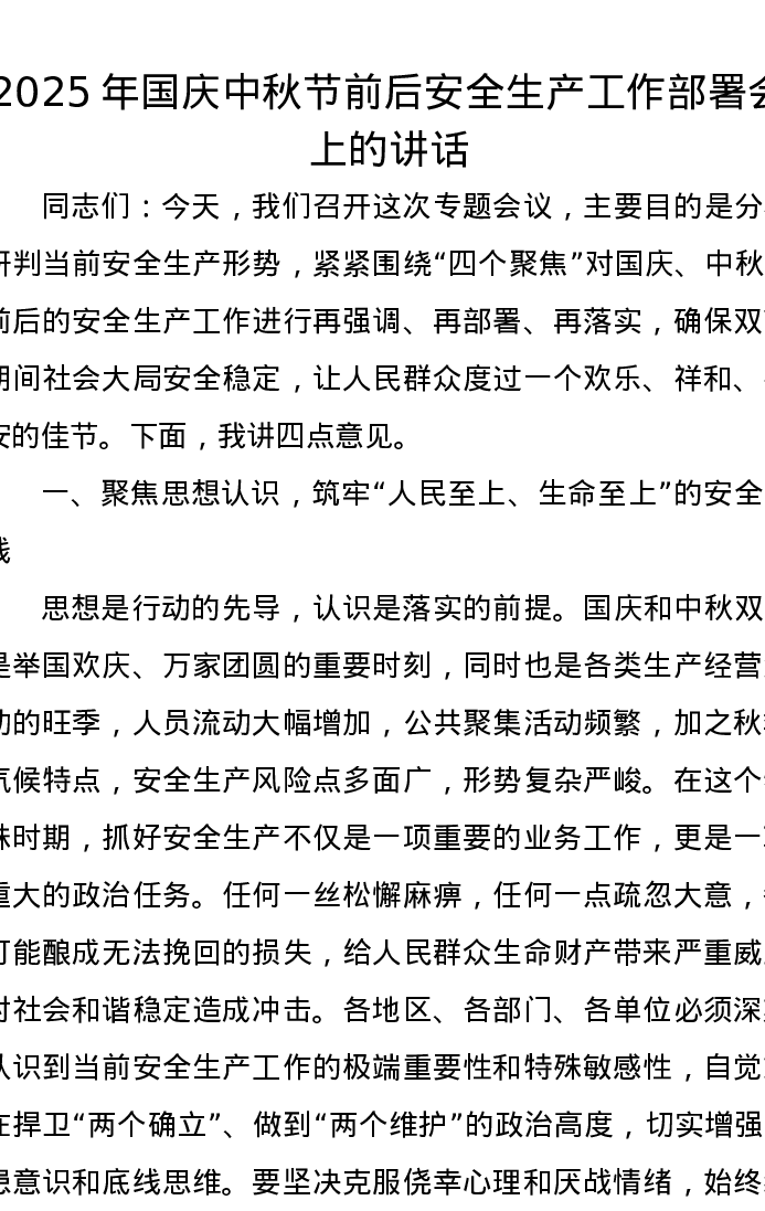 2025年国庆中秋节前后安全生产工作部署会上的讲话