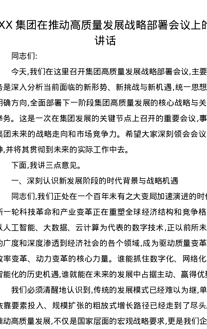 XX集团在推动高质量发展战略部署会议上的讲话
