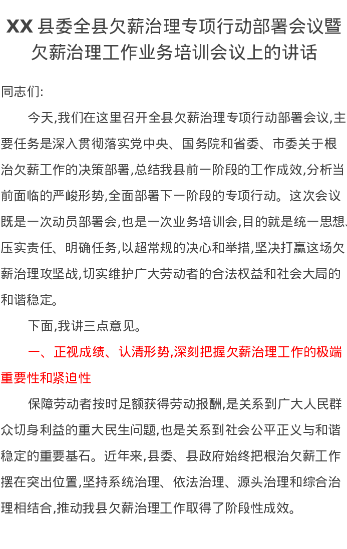XX县委全县欠薪治理专项行动部署会议暨欠薪治理工作业务培训会议上的讲话