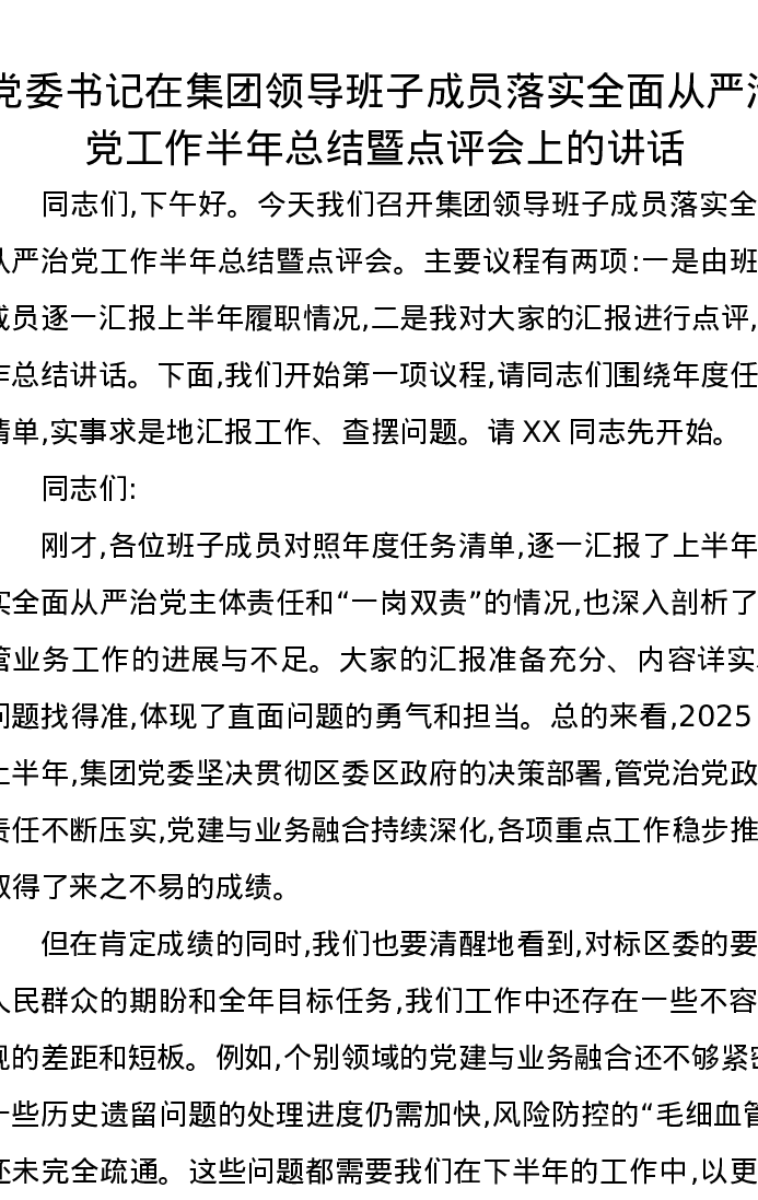 党委书记在集团领导班子成员落实全面从严治党工作半年总结暨点评会上的讲话