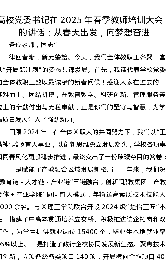 高校党委书记在2025年春季教师培训大会上的讲话:从春天出发,向梦想奋进