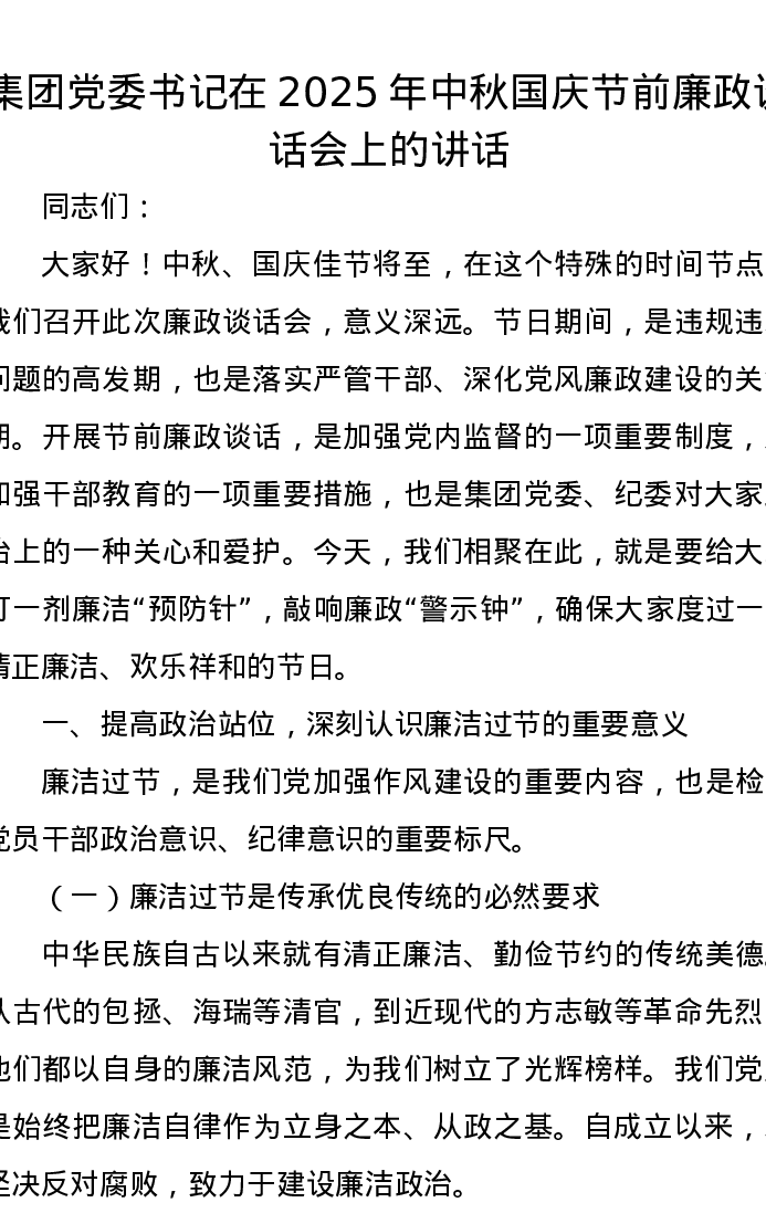 集团党委书记在2025年中秋国庆节前廉政谈话会上的讲话