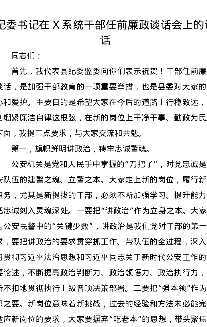 纪委书记在X系统干部任前廉政谈话会上的讲话