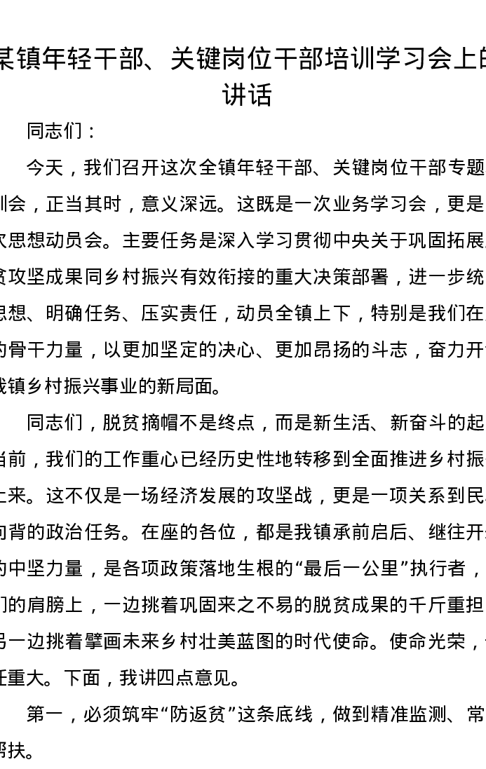 某镇年轻干部、关键岗位干部培训学习会上的讲话