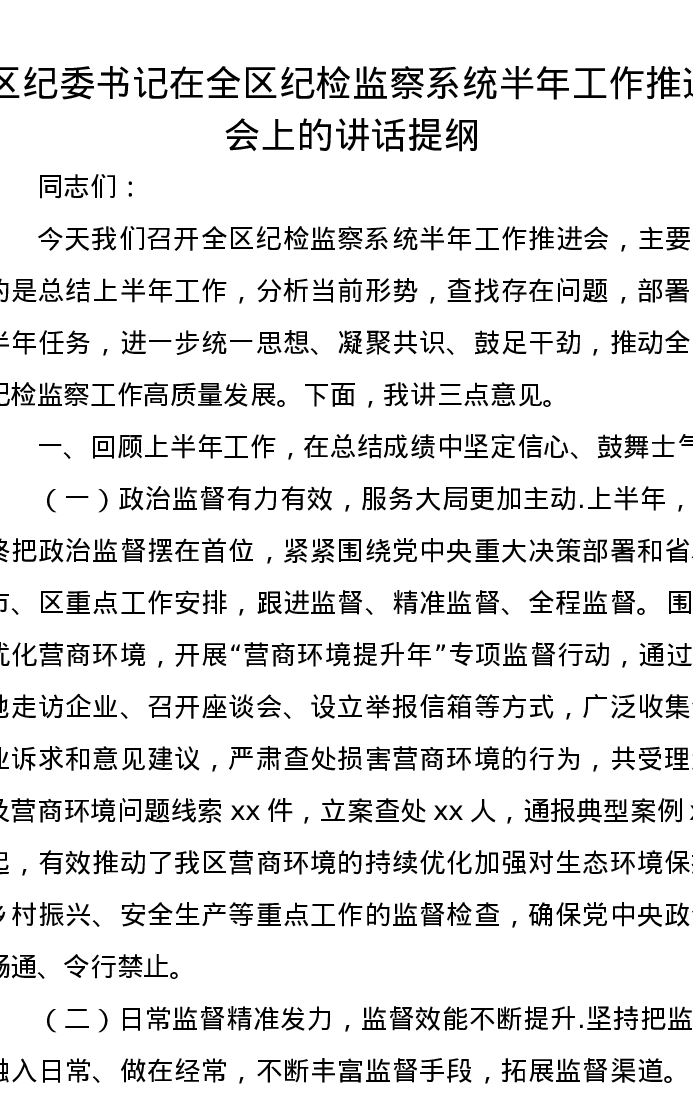 区纪委书记在全区纪检监察系统半年工作推进会上的讲话提纲