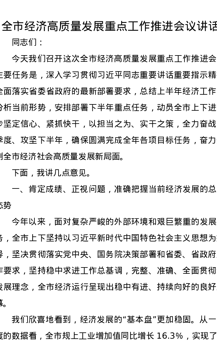 全市经济高质量发展重点工作推进会议讲话