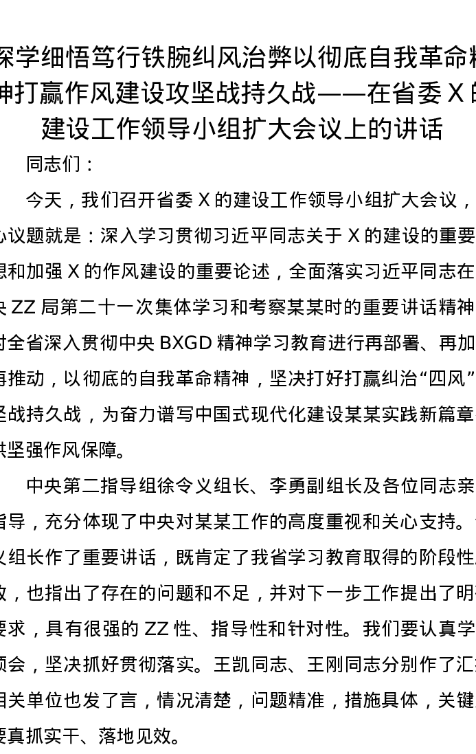 深学细悟笃行铁腕纠风治弊以彻底自我革命精神打赢作风建设攻坚战持久战——在省委X的建设工作领导小组扩大会议上的讲话