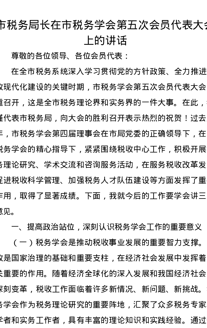 市税务局长在市税务学会第五次会员代表大会上的讲话