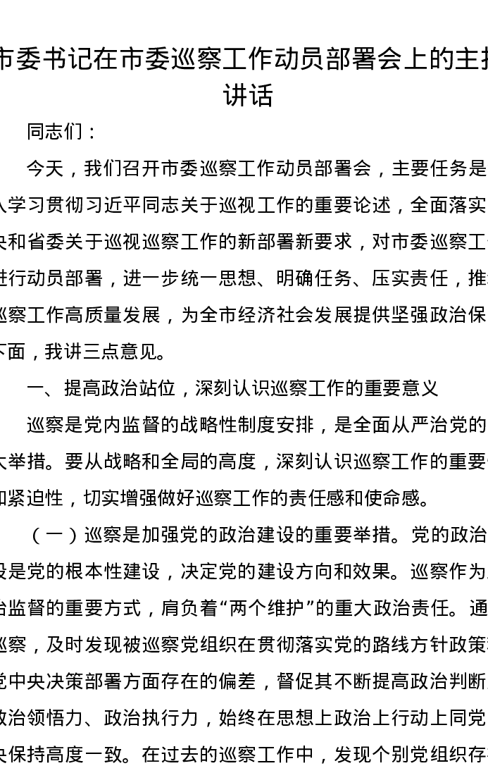 市委书记在市委巡察工作动员部署会上的主持讲话