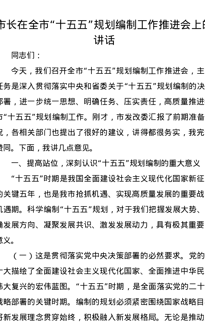 市长在全市“十五五”规划编制工作推进会上的讲话