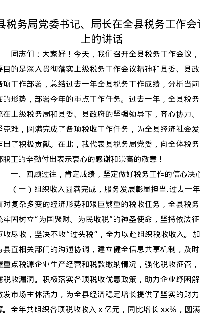 县税务局党委书记、局长在全县税务工作会议上的讲话