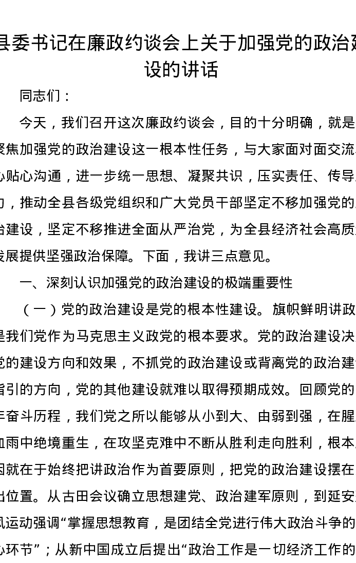 县委书记在廉政约谈会上关于加强党的政治建设的讲话