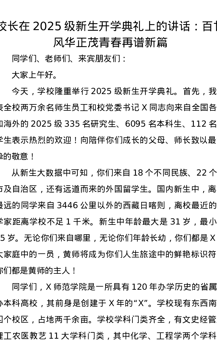 校长在2025级新生开学典礼上的讲话:百廿风华正茂青春再谱新篇