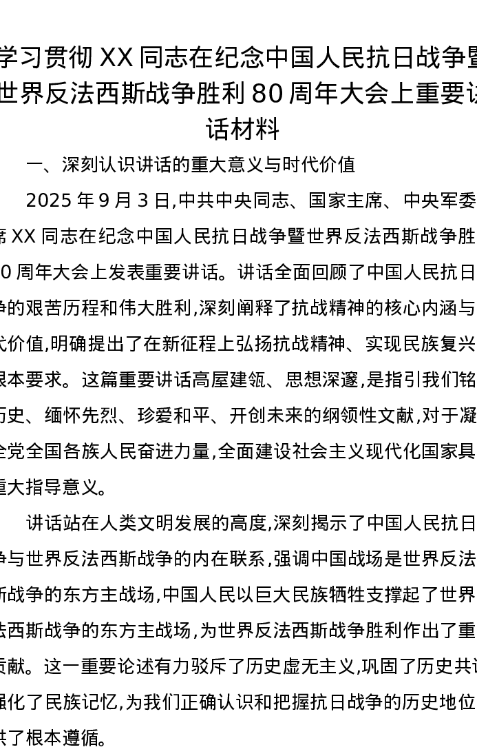 学习贯彻XX同志在纪念中国人民抗日战争暨世界反法西斯战争胜利80周年大会上重要讲话材料