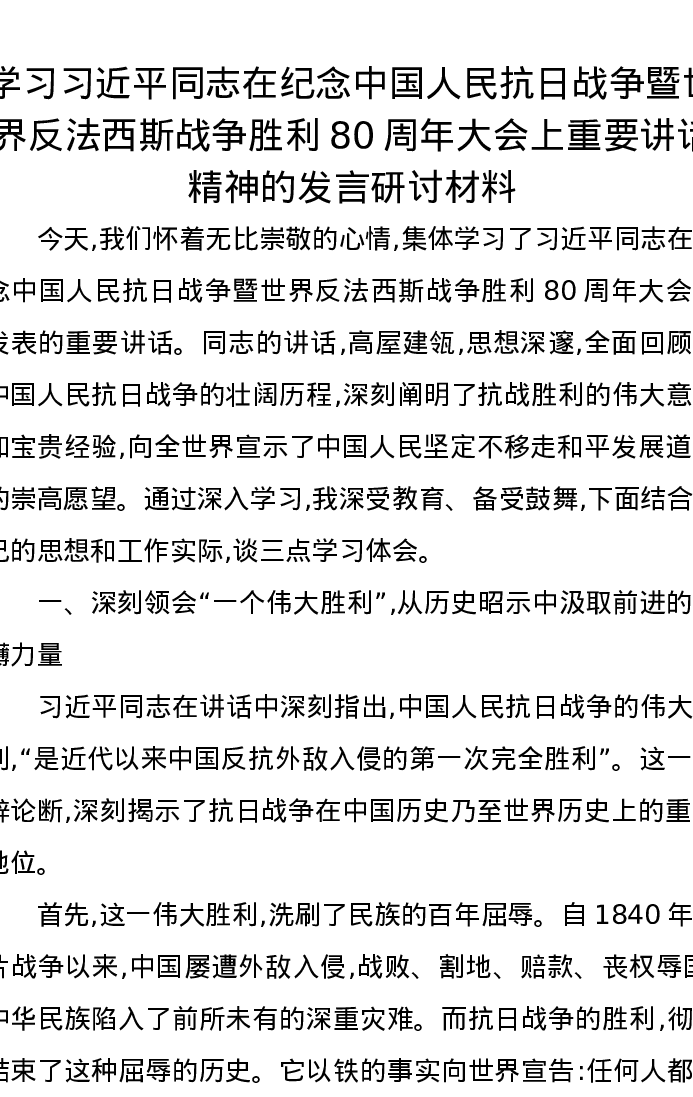 学习习近平总书记在纪念中国人民抗日战争暨世界反法西斯战争胜利80周年大会上重要讲话精神的发言研讨材料