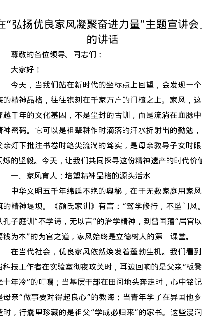 在“弘扬优良家风凝聚奋进力量”主题宣讲会上的讲话