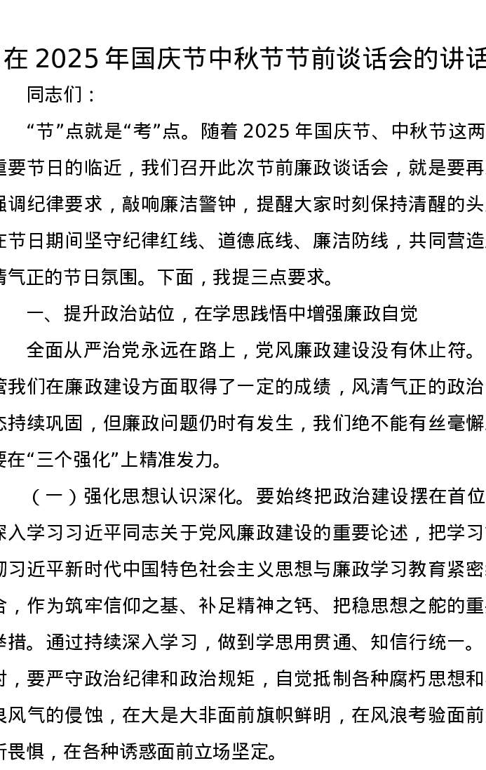 在2025年国庆节中秋节节前谈话会的讲话