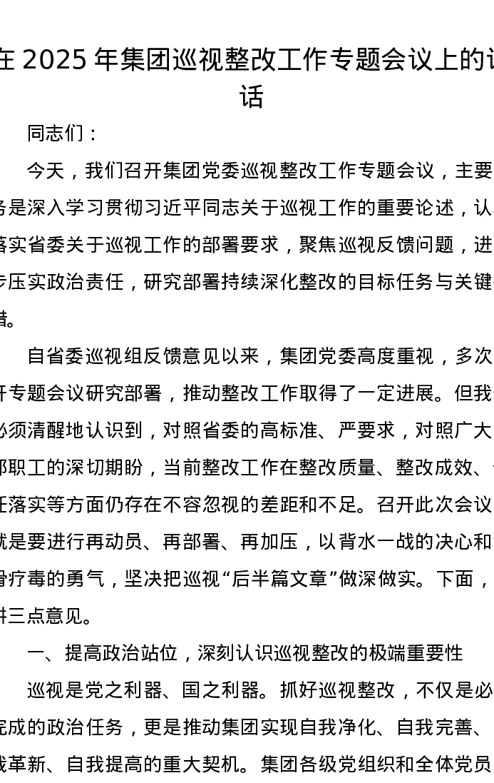在2025年集团巡视整改工作专题会议上的讲话