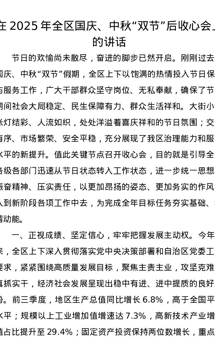 在2025年全区国庆、中秋“双节”后收心会上的讲话
