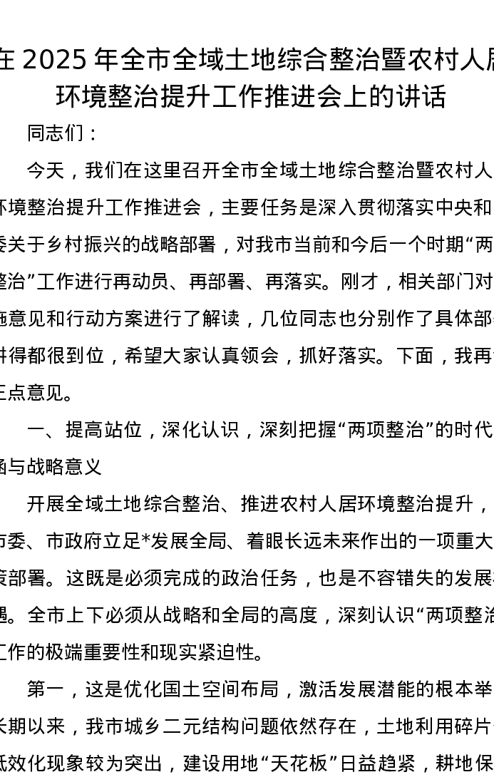 在2025年全市全域土地综合整治暨农村人居环境整治提升工作推进会上的讲话