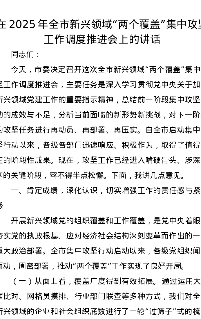 在2025年全市新兴领域“两个覆盖”集中攻坚工作调度推进会上的讲话