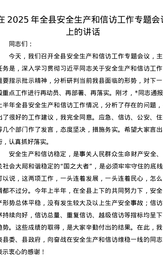 在2025年全县安全生产和信访工作专题会议上的讲话