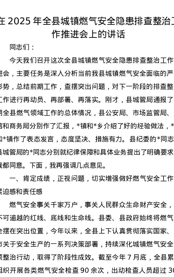 在2025年全县城镇燃气安全隐患排查整治工作推进会上的讲话