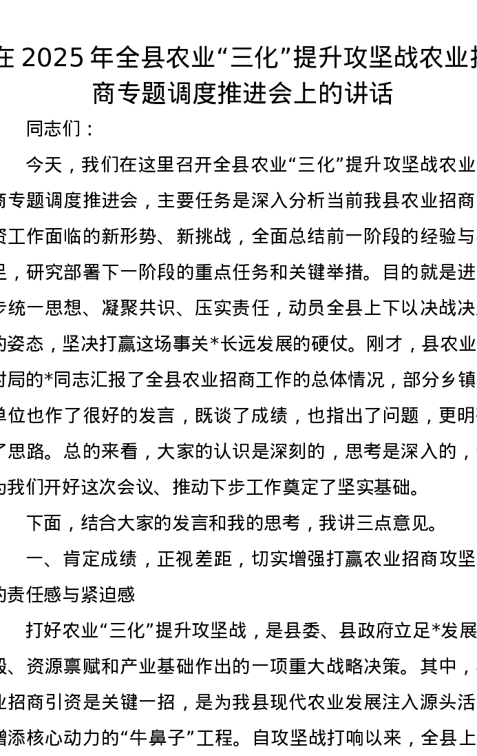 在2025年全县农业“三化”提升攻坚战农业招商专题调度推进会上的讲话