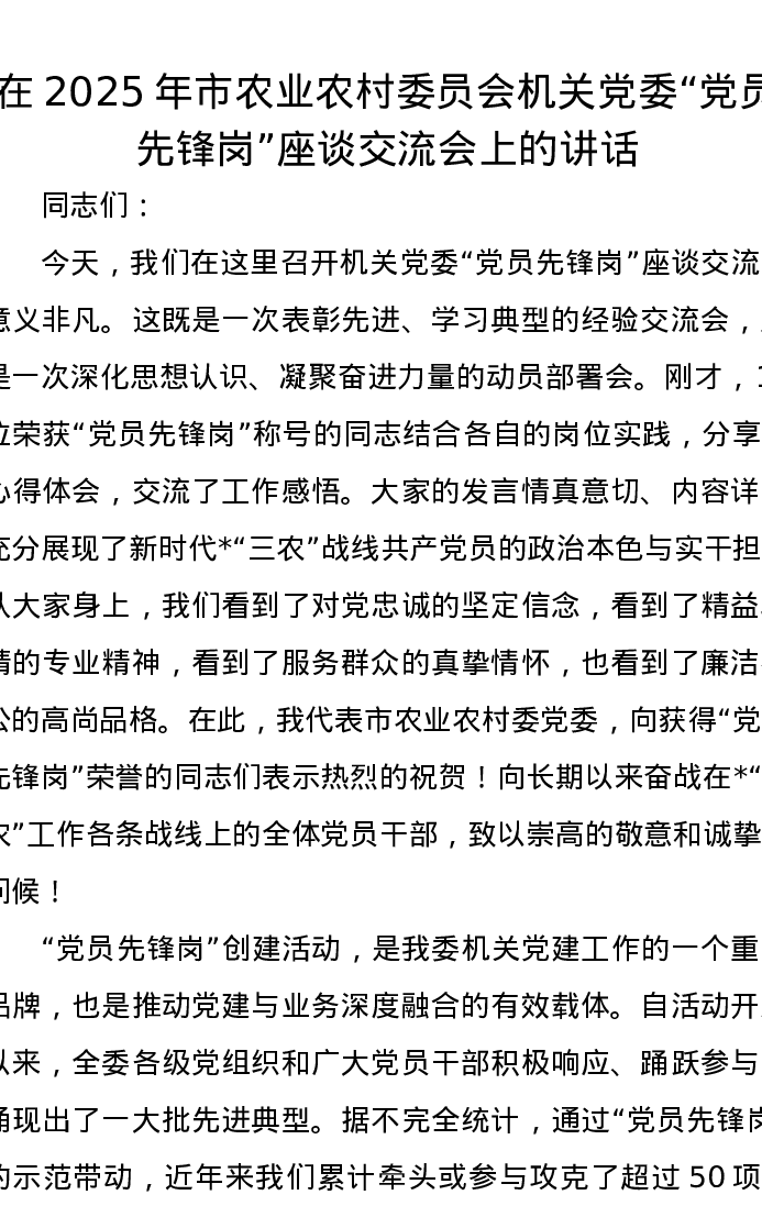 在2025年市农业农村委员会机关党委“党员先锋岗”座谈交流会上的讲话