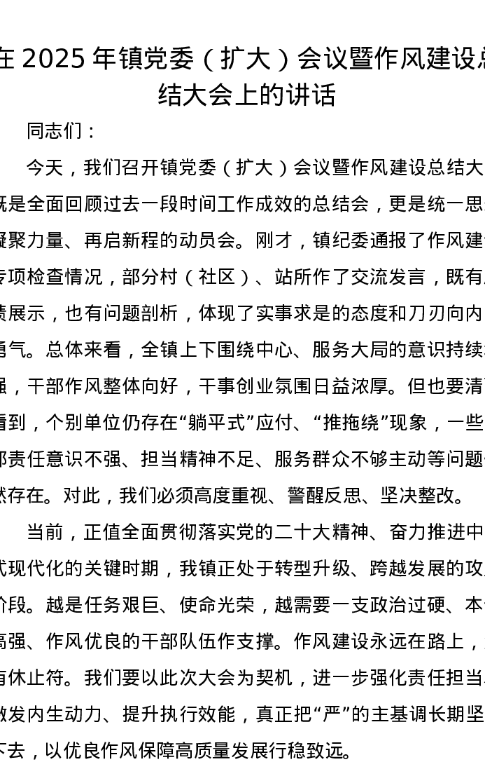 在2025年镇党委(扩大)会议 暨作风建设总结大会上的讲话