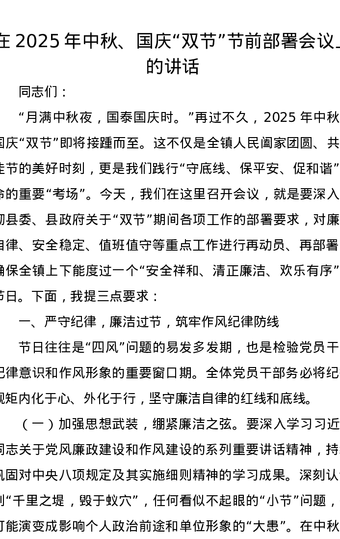 在2025年中秋、国庆“双节”节前部署会议上的讲话