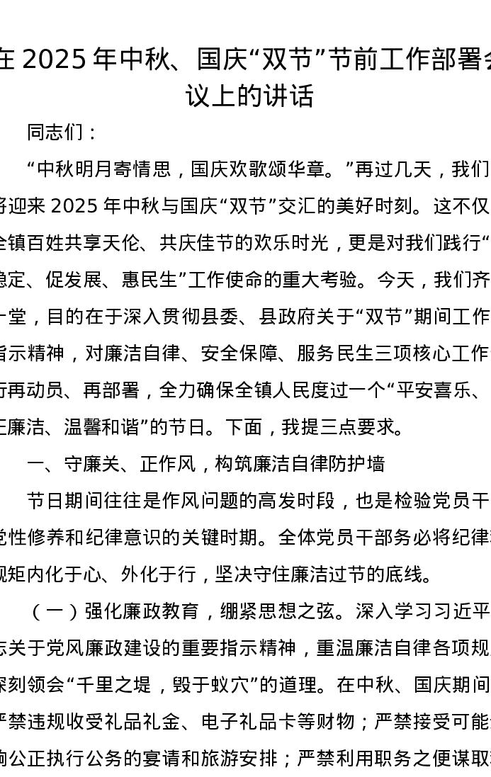 在2025年中秋、国庆“双节”节前工作部署会议上的讲话