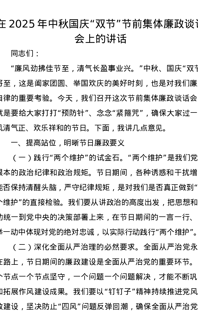 在2025年中秋国庆“双节”节前集体廉政谈话会上的讲话