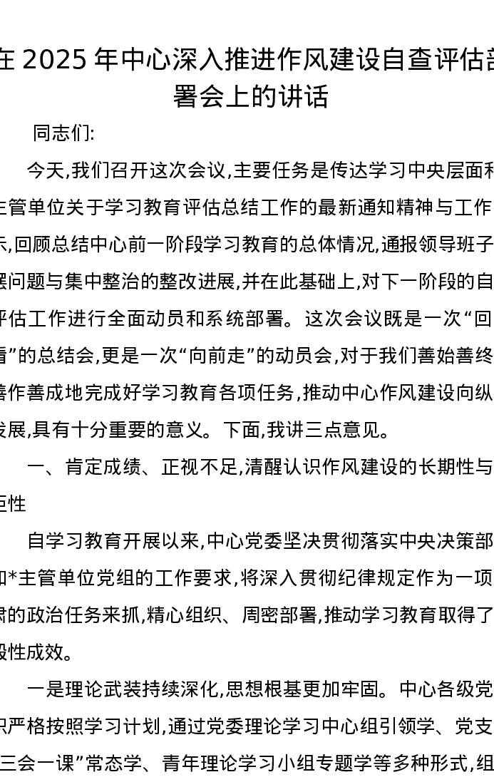 在2025年中心深入推进作风建设自查评估部署会上的讲话