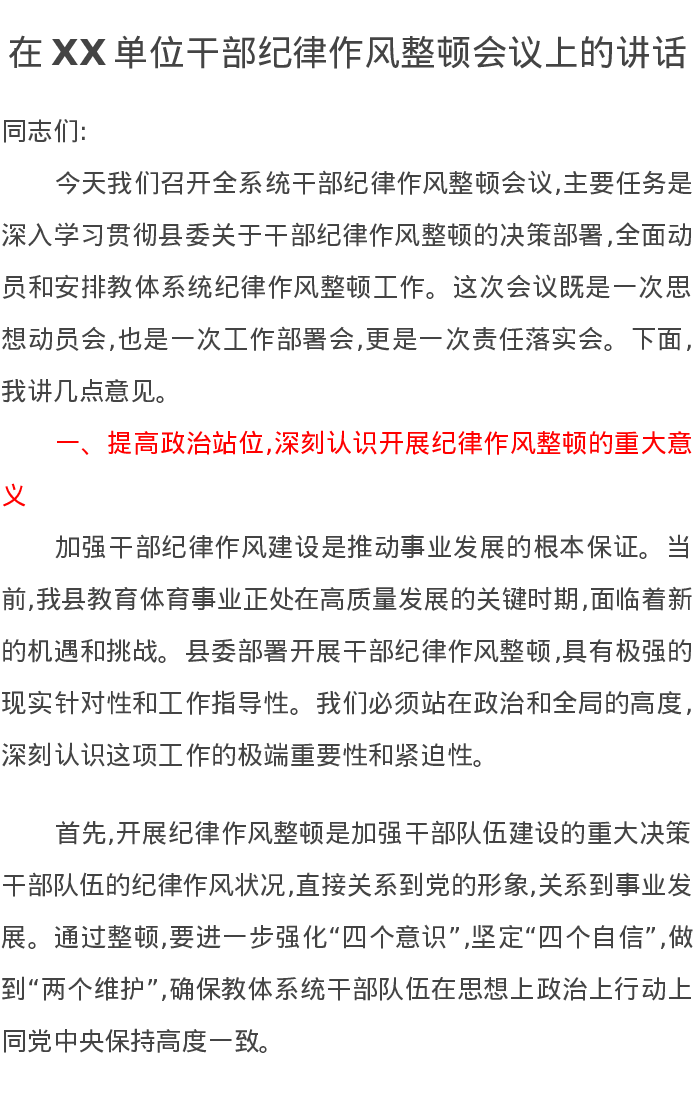 在XX单位干部纪律作风整顿会议上的讲话