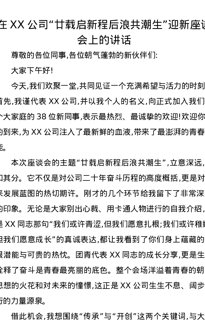 在XX公司“廿载启新程后浪共潮生”迎新座谈会上的讲话