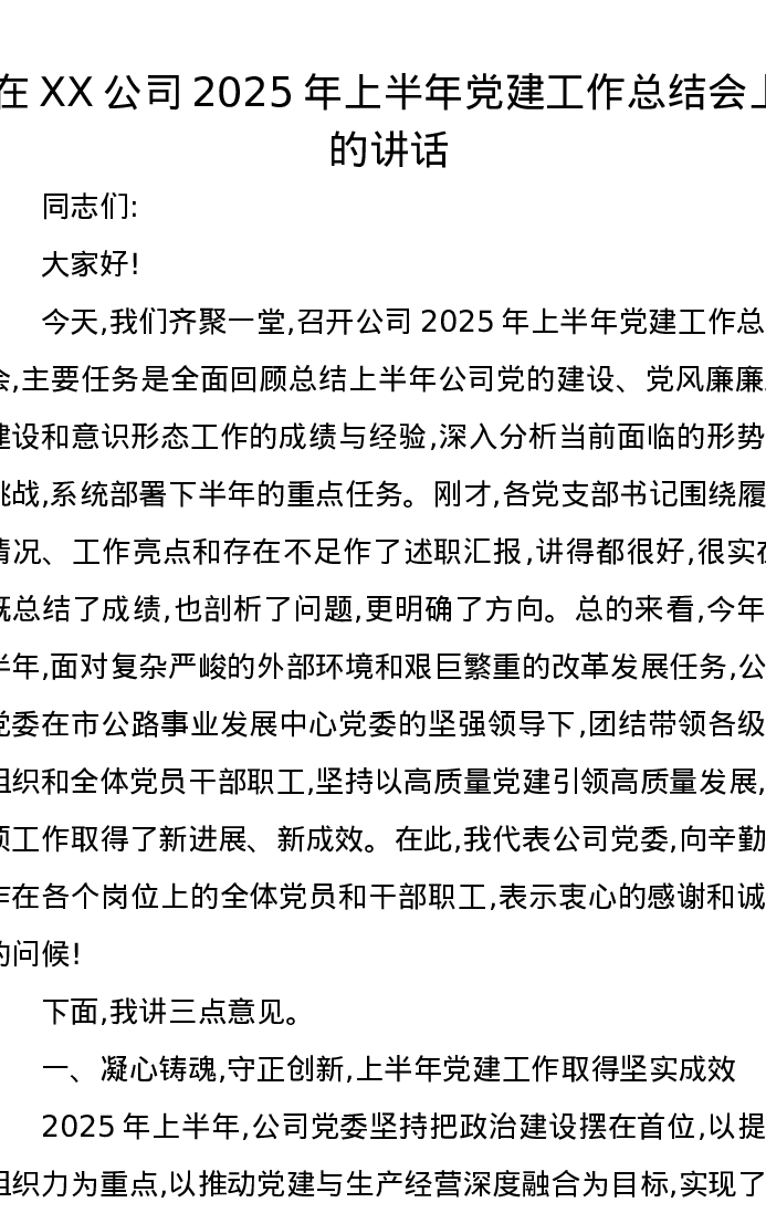 在XX公司2025年上半年党建工作总结会上的讲话