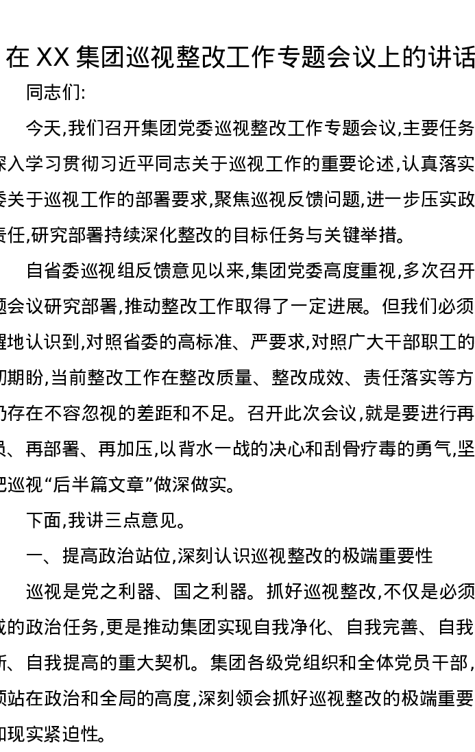 在XX集团巡视整改工作专题会议上的讲话
