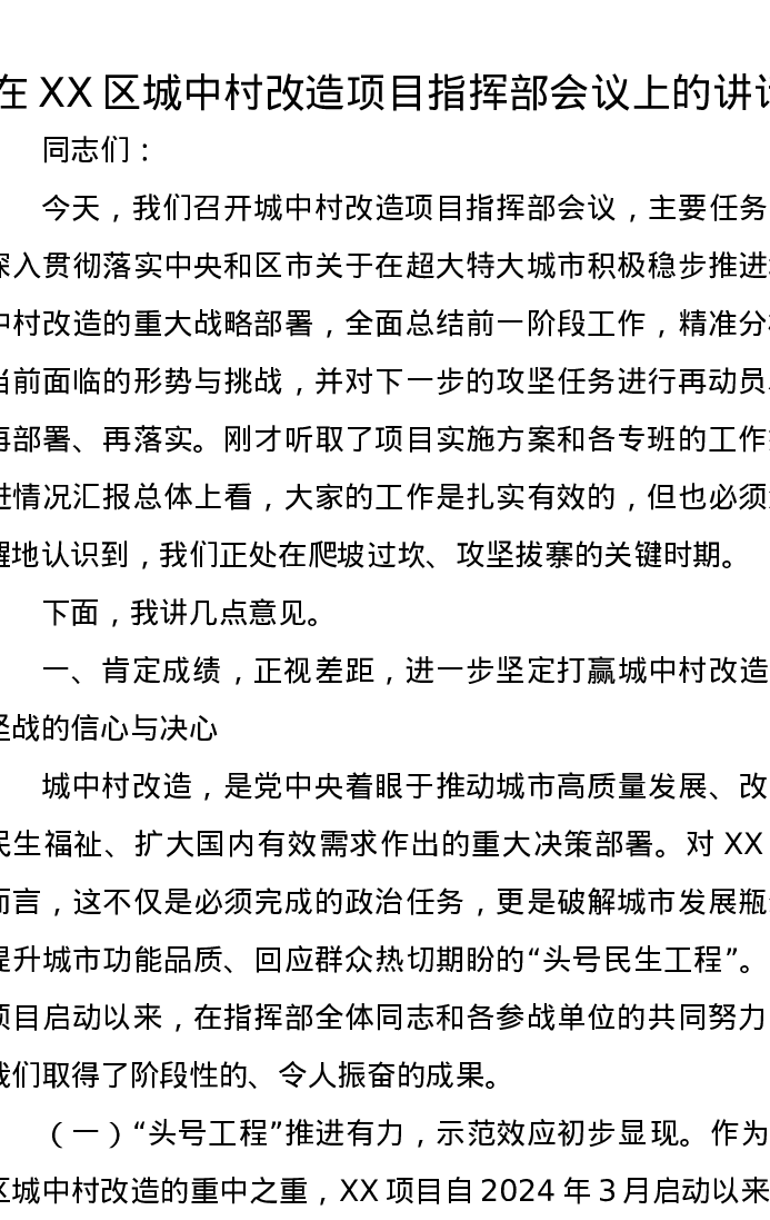 在XX区城中村改造项目指挥部会议上的讲话