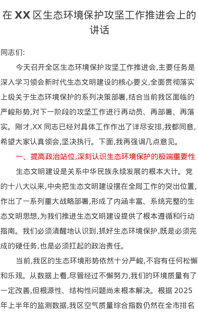 在XX区生态环境保护攻坚工作推进会上的讲话