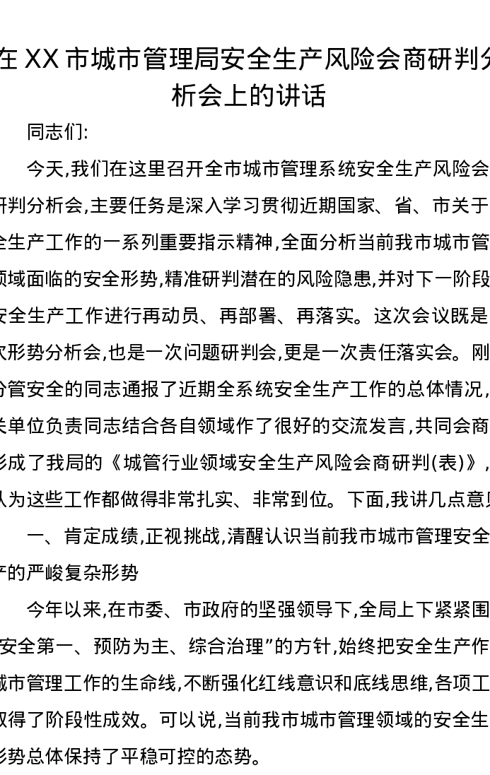 在XX市城市管理局安全生产风险会商研判分析会上的讲话