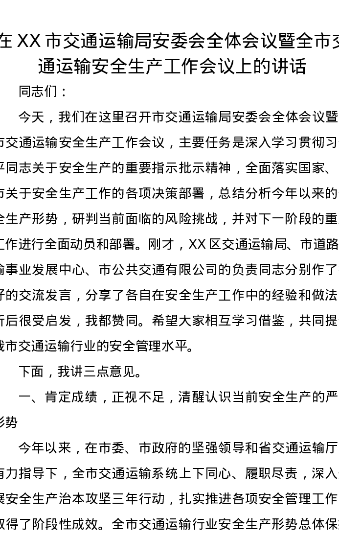 在XX市交通运输局安委会全体会议暨全市交通运输安全生产工作会议上的讲话