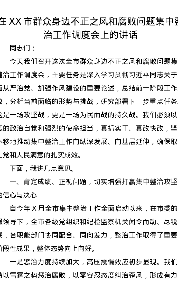 在XX市群众身边不正之风和腐败问题集中整治工作调度会上的讲话