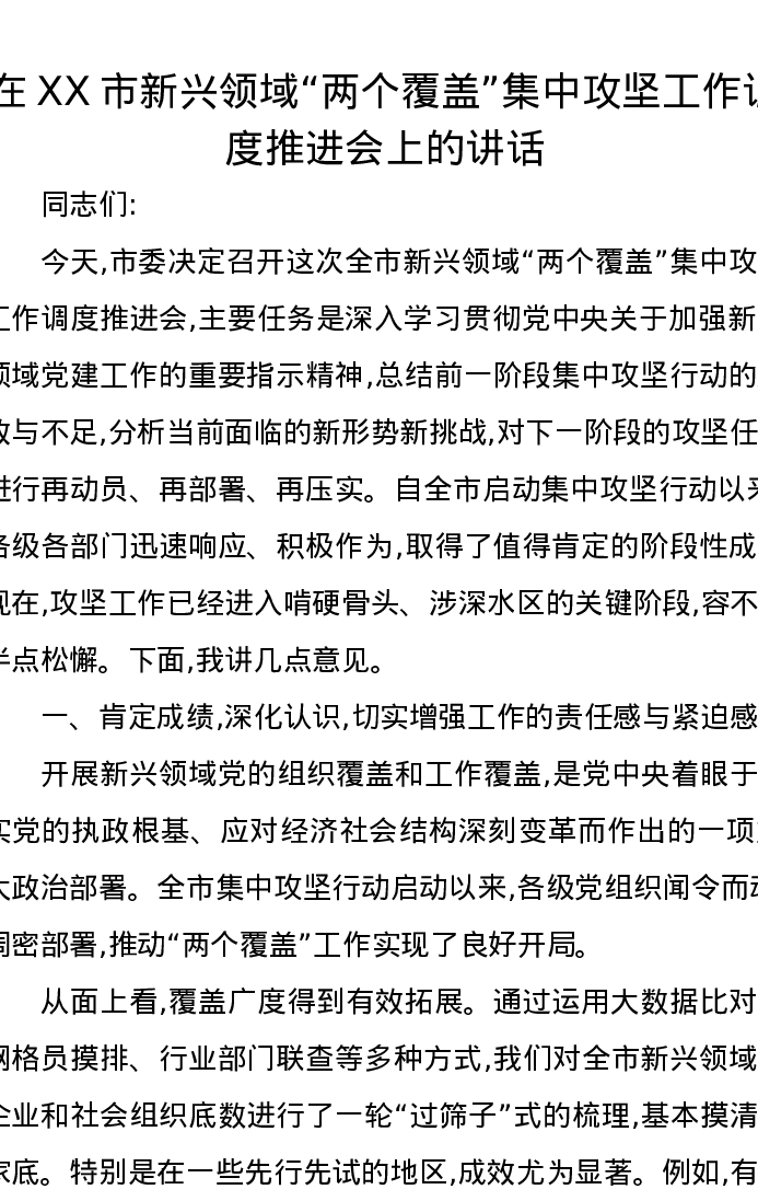 在XX市新兴领域“两个覆盖”集中攻坚工作调度推进会上的讲话