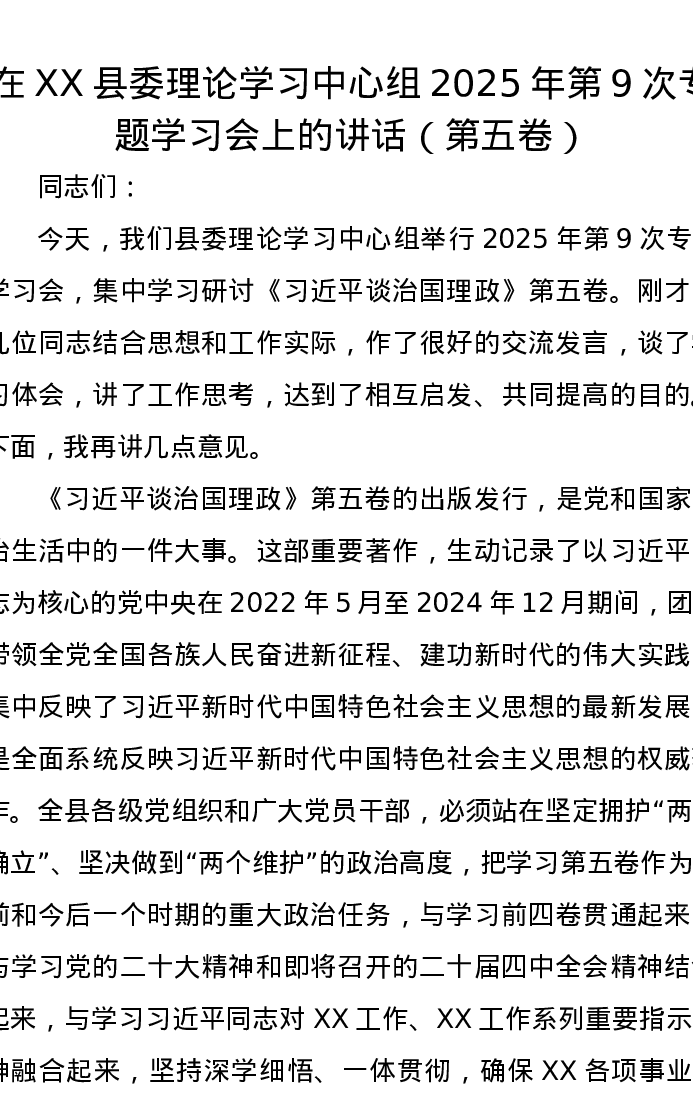 在XX县委理论学习中心组2025年第9次专题学习会上的讲话(《治国理政》第五卷)