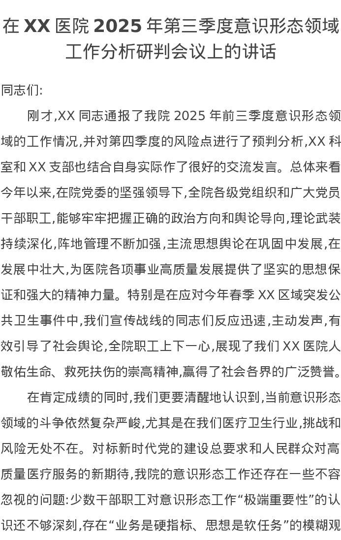 在XX医院2025年第三季度意识形态领域工作分析研判会议上的讲话