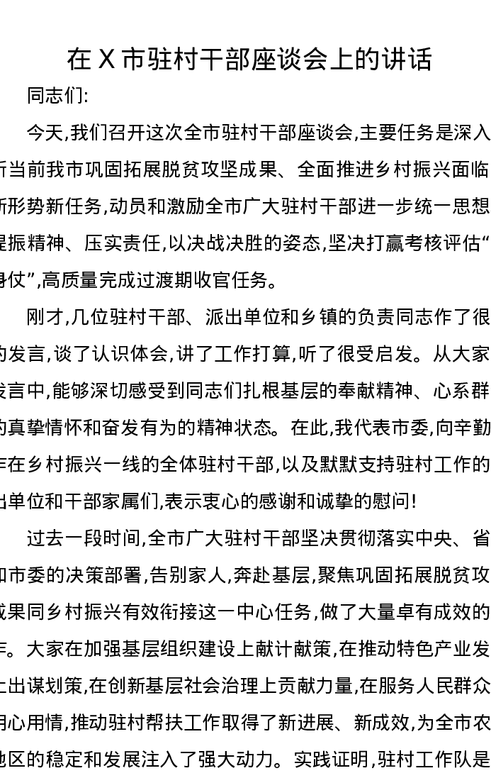 在X市驻村干部座谈会上的讲话