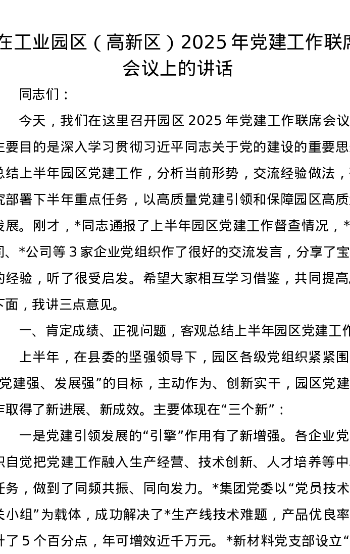 在工业园区(高新区)2025年党建工作联席会议上的讲话