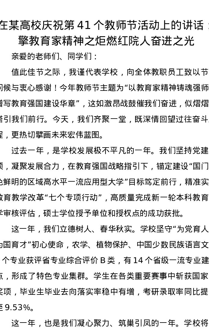 在某高校庆祝第41个教师节活动上的讲话:擎教育家精神之炬燃红院人奋进之光